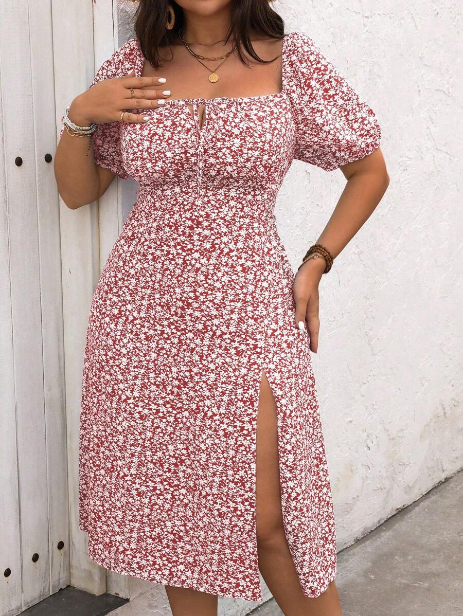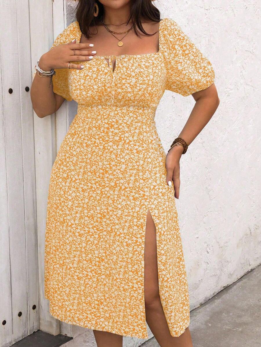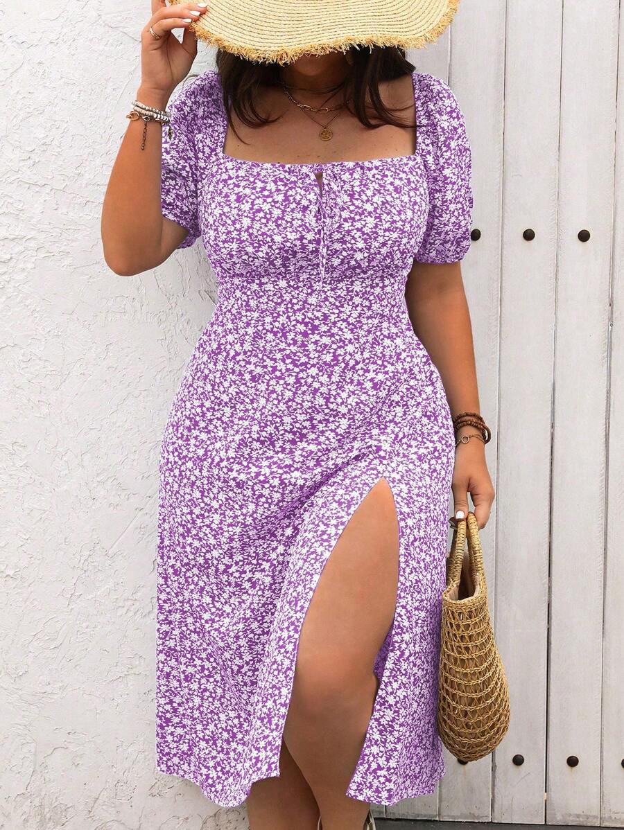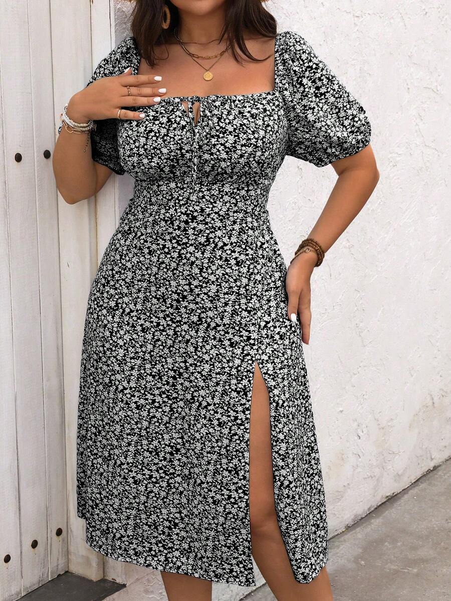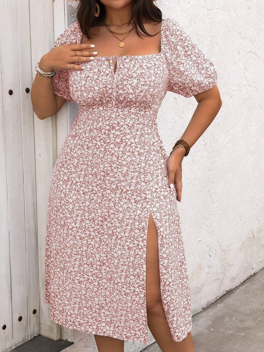 Vestido de verano de talla grande con escote cuadrado, estampado floral "ditsy", lazo delantero y abertura lateral para vacaciones, para mujeres