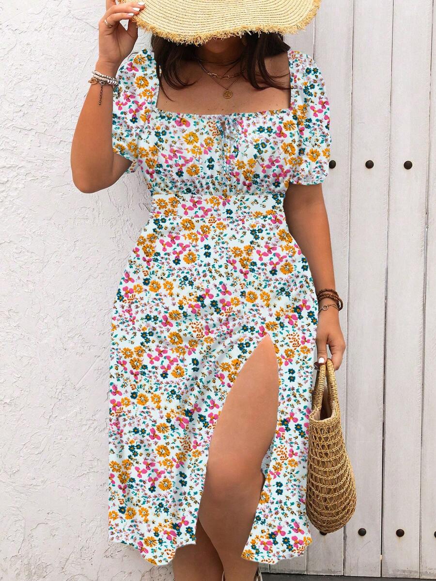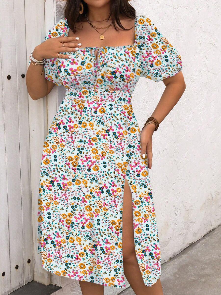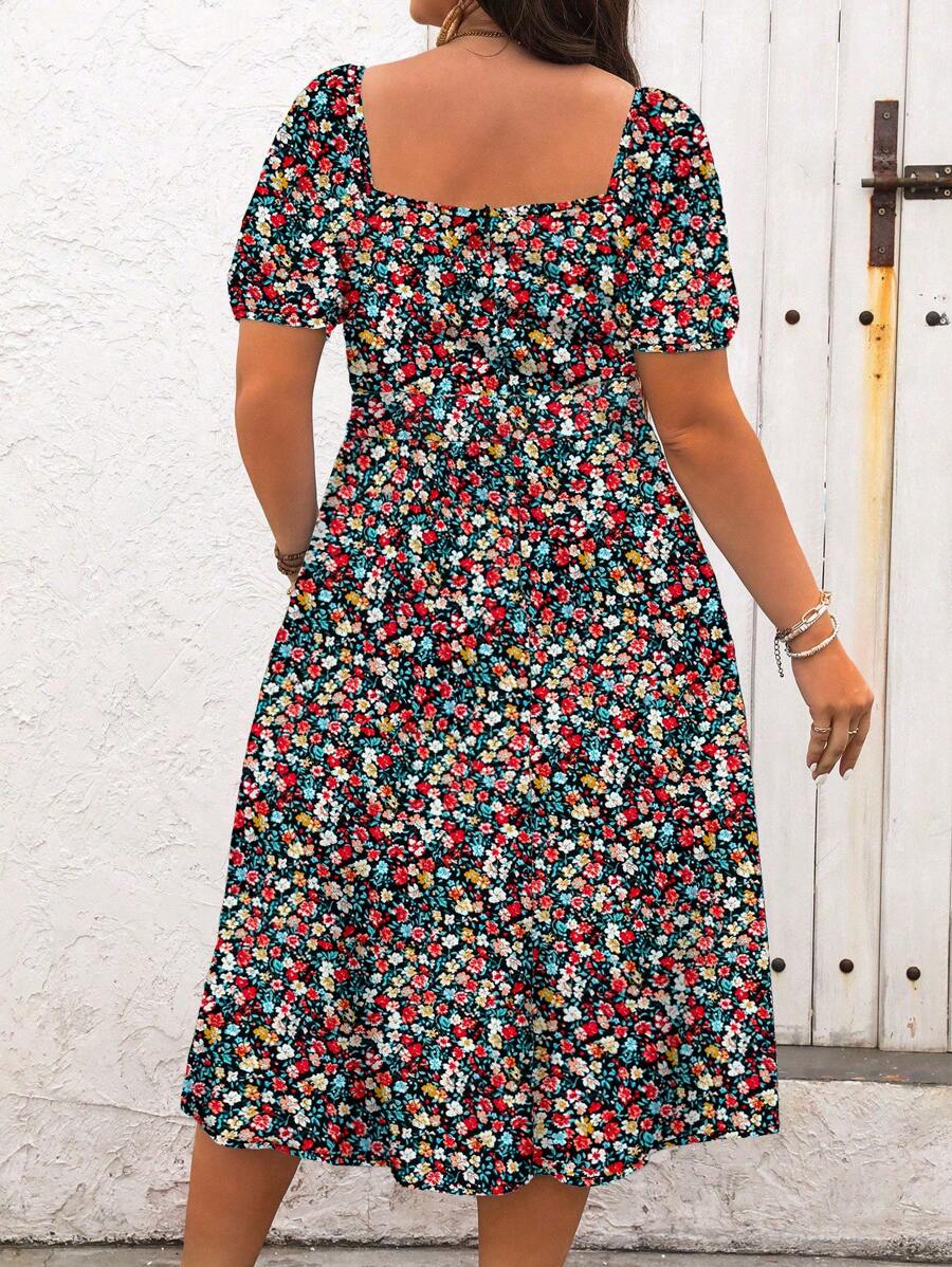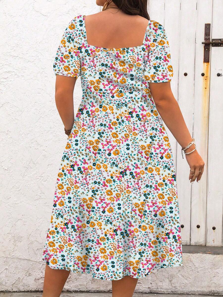 Vestido de verano de talla grande con escote cuadrado, estampado flora – Muy Bonita