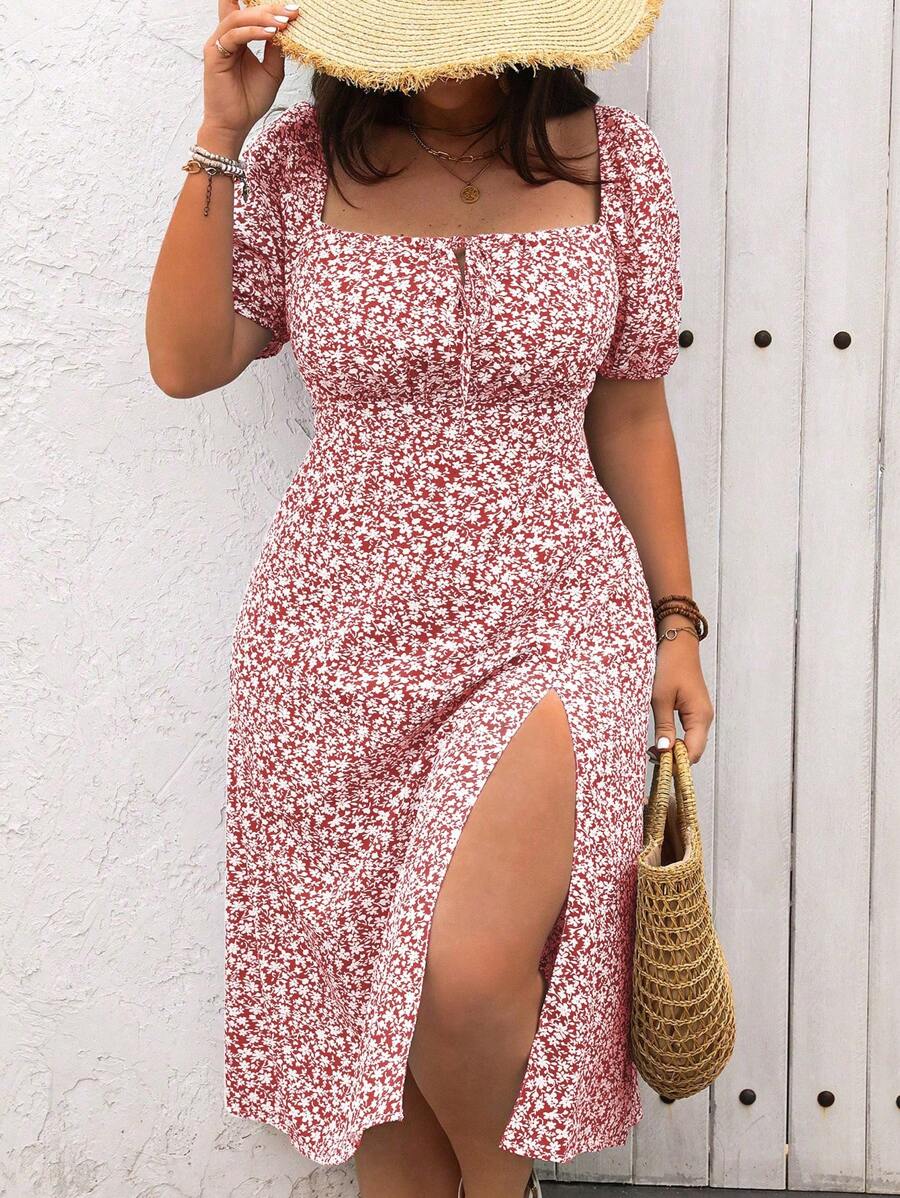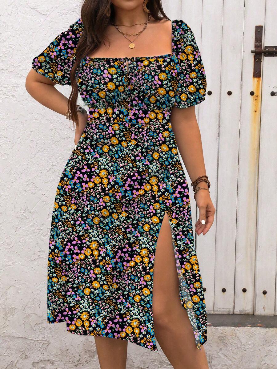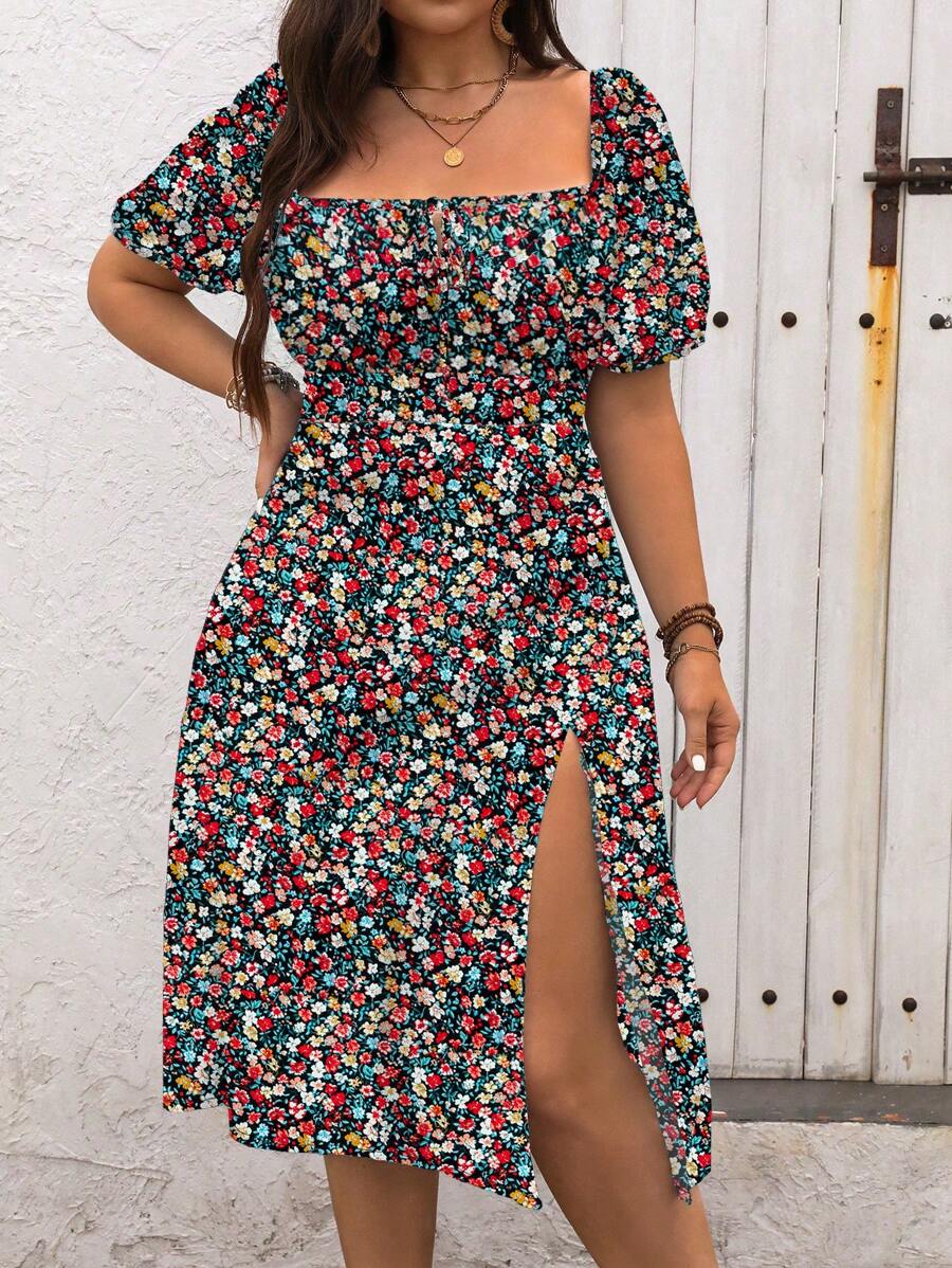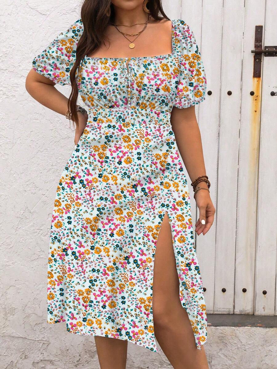 Vestido de verano de talla grande con escote cuadrado, estampado flora – Muy Bonita
