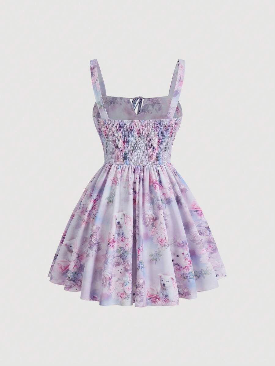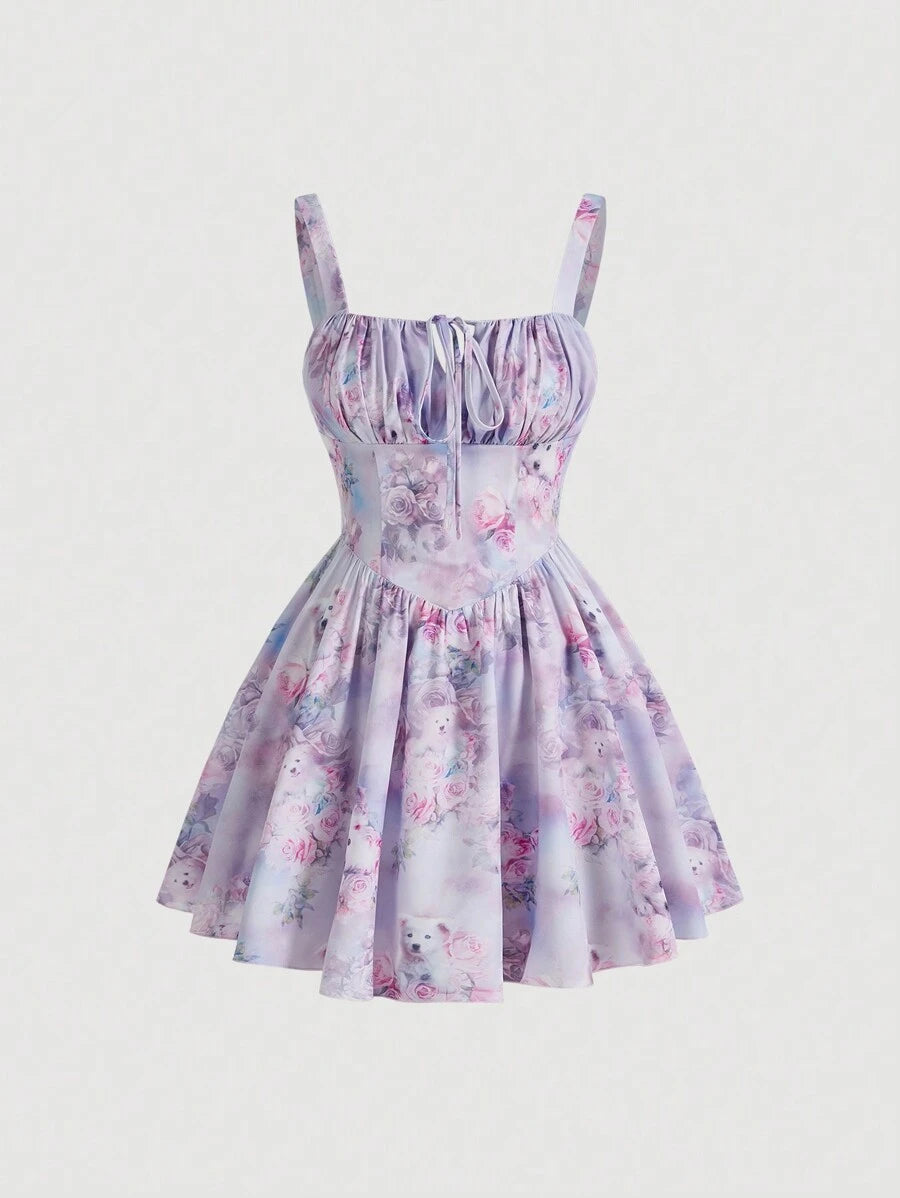 Vestido con tirantes plisados de verano para mujeres de talla grande con disenos impresos de flores y perros
