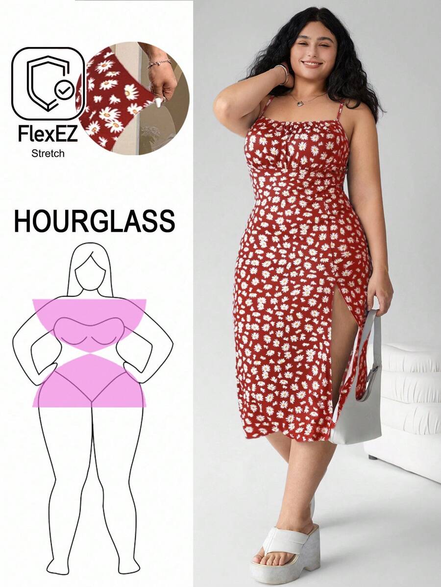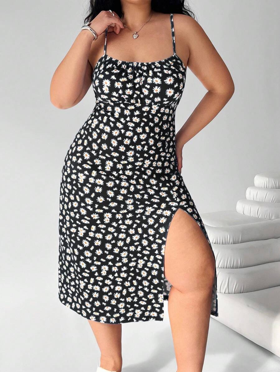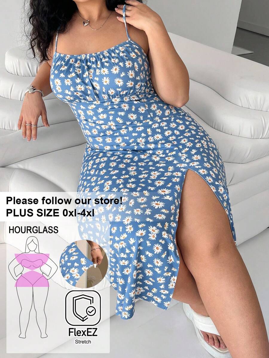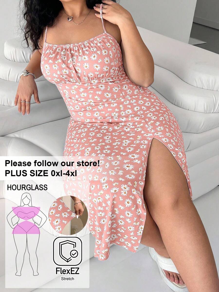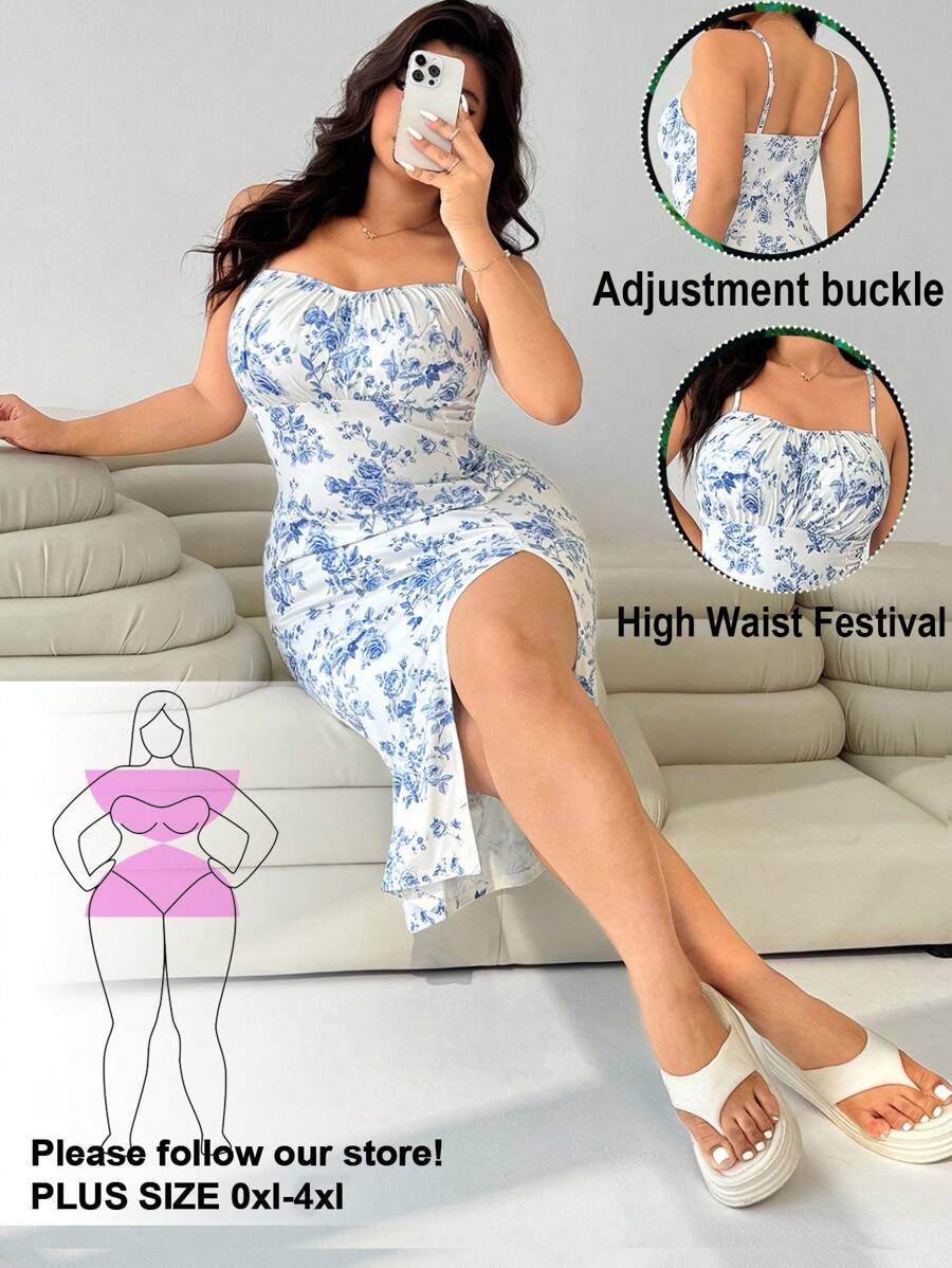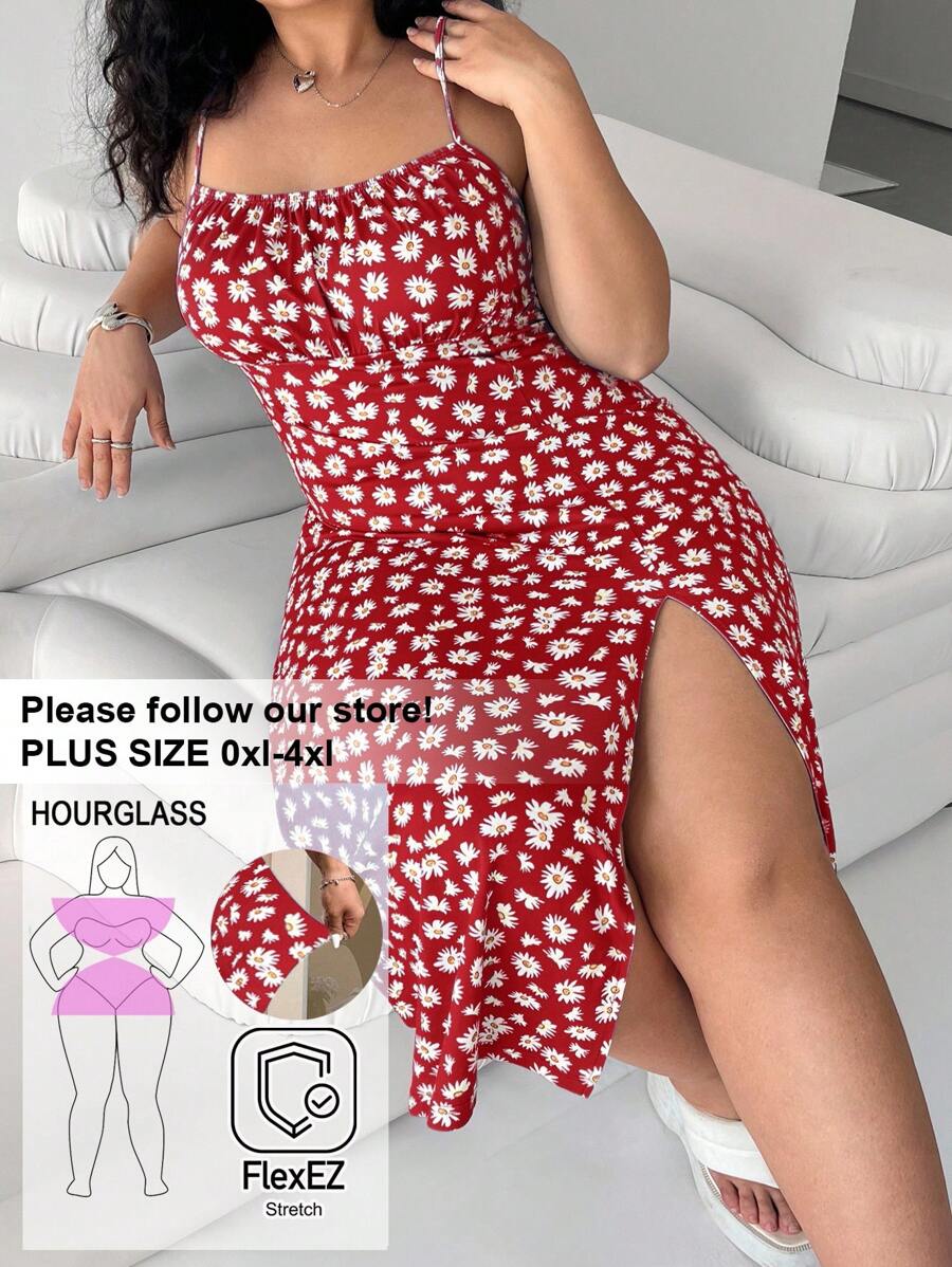 Vestido casual con tirantes de espagueti y estampado todo sobre con bajo dividido para mujeres de talla grande, vestido hawaiano para mujeres, vestido casual para mujeres, ropa de primavera, vestido de fiesta de vacaciones de estilo bohemio
